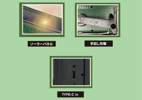 その他緊急充電に手回し充電やソーラー充電、スマホへの給電機能を搭載!