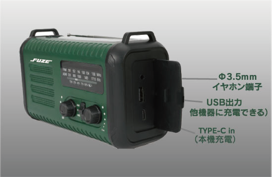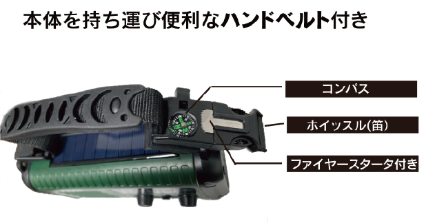 | 充電機能 | 手回し充電5V1.5W ソーラーバッテリー5V1.5 W/USB端子5V2.1A |