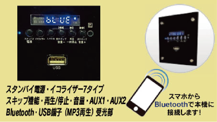 ■Bluetoothやテレビ・DVD機器を外部入力から、ミュージックや映画などが お好みに合わせて7種類のイコライザー(ノーマル1・ノーマル2・POP・ROCK・ JAZZ・CLASSIC・COUNTRY)音響効果が楽しめる