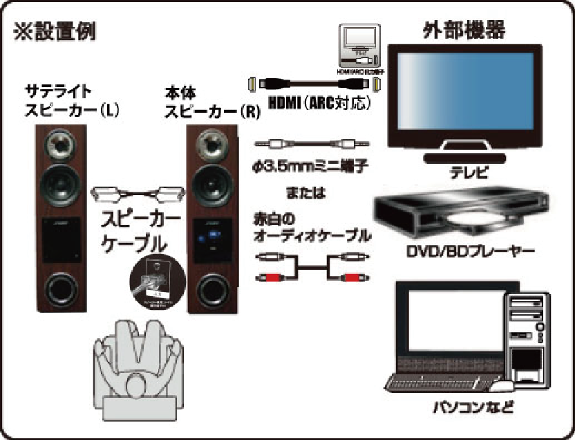 本機とサテライトスピーカーと繋げる付属の高音質